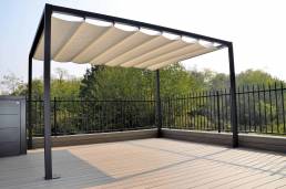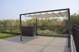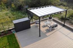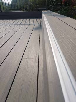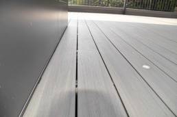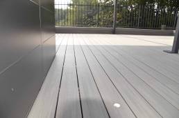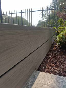 Pavimentazione a doghe modello ULTRASHIELD colore grigio Antique posato direttamente sul giardino del cliente perfettamente integrato con la vegetazione, corpi illuminanti integrati a scomparsa nelle doghe, rivestimento del muretto in cemento che ha cambiato aspetto.